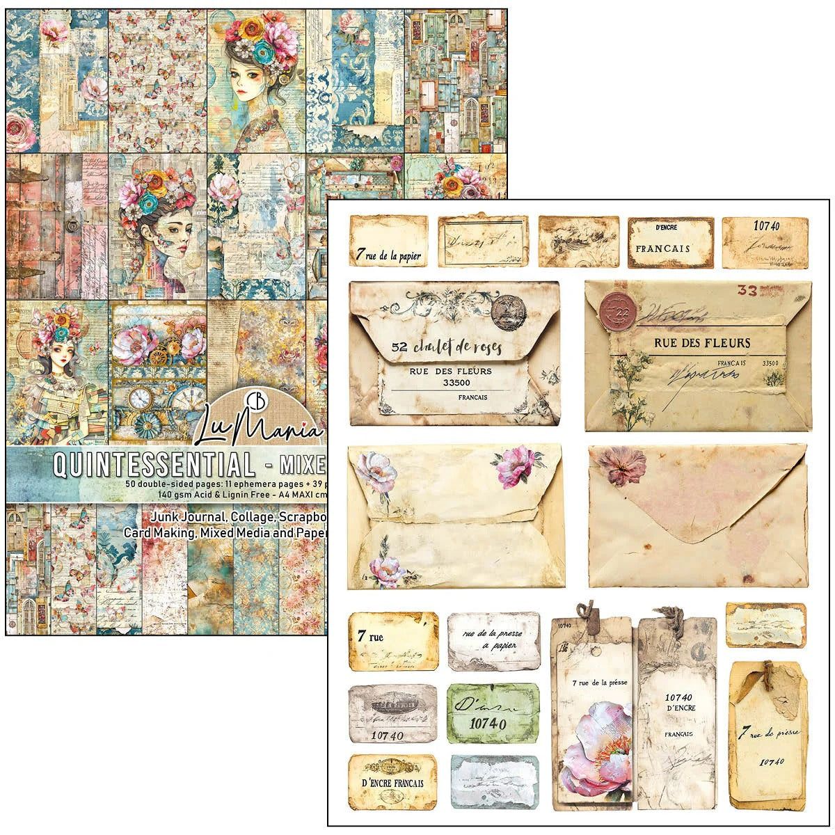 This A4 Mixed Media Book Quintessential set includes 50 double-sided pages, including: 39 unique patterned designs and 11 ephemera pages with cards, tags, tickets, fussy-cut elements, and other decorative goodies. Unleash your style with the colourful hues and the vintage rustic textures and illustrations featuring women, florals, butterflies and more. Perfect for junk journal, collage, scrapbooking, cardmaking, mixed media and paper craft arts.