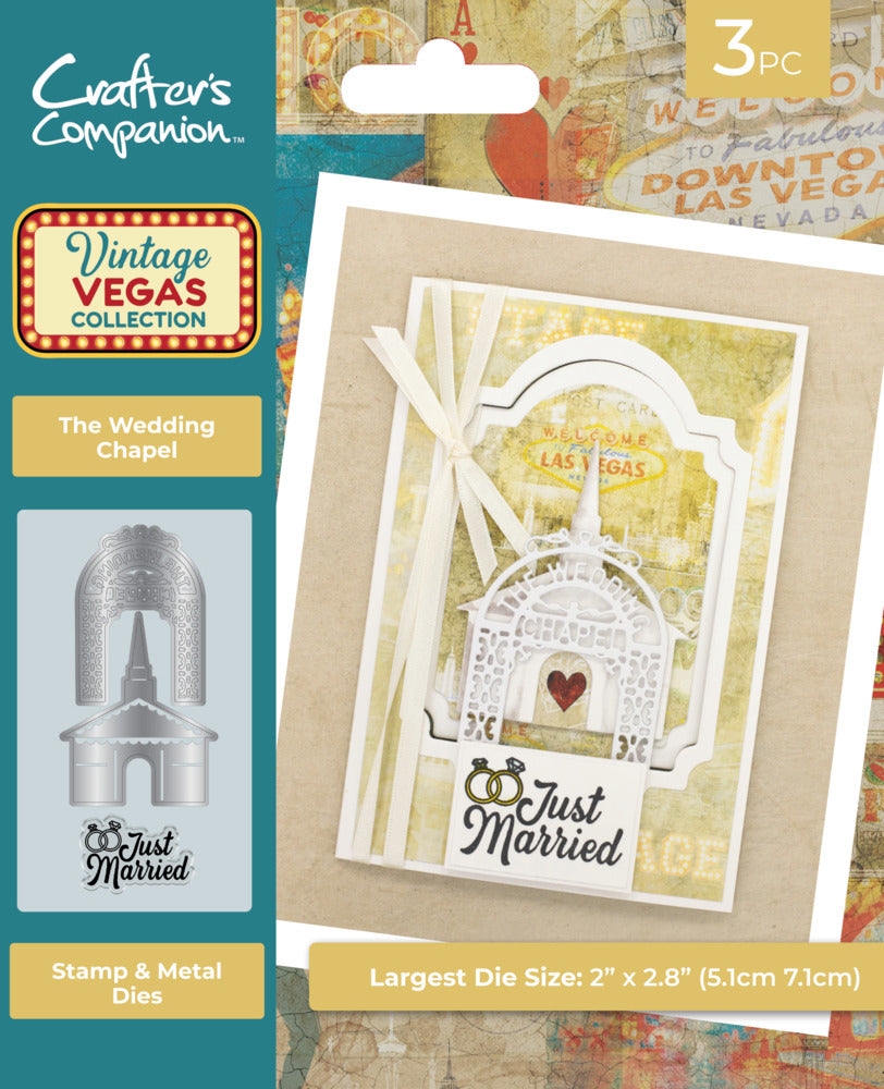VV-STD-TWCTop your handmade cards, gift boxes, bags or scrapbook pages with Vintage Vegas Stamp & Die sets from Crafter's Companion. This set includes a sentiment stamp saying 'Just Married' and a matching die to cut out the outline of the Little White Chapel.