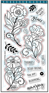 22361This 4x8 stamp set has three beautiful blossoms that can be used together or individually! "You are Blooming Amazing" is the theme for this great stamp set. Combine the words to say "Bloom with Grace", "Get Well Dear Friend" and "THANKS Dear Friend You are BLOOMING Amazing".