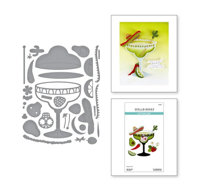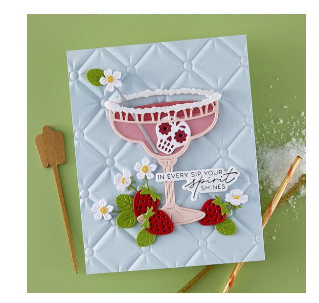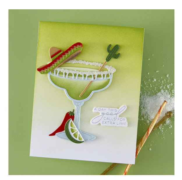 Sip Sip Ole’ Etched Dies are part of the Happier Hour Collection. When assembled, this set of 27 thin metal cutting dies creates festive drinks based on a stemmed wide rim Margarita glass. Details include a line of salt to set on the glass rim and plenty of garnishes to choose from. For extra fun, there are accents to add to set the vibe: sombrero, cactus, sugar skull, strawberry and more! Full of playful margarita puns, BP-337 Sip Sip Ole Sentiments BetterPress Plates. is sure to add the perfect finishing message to your project.