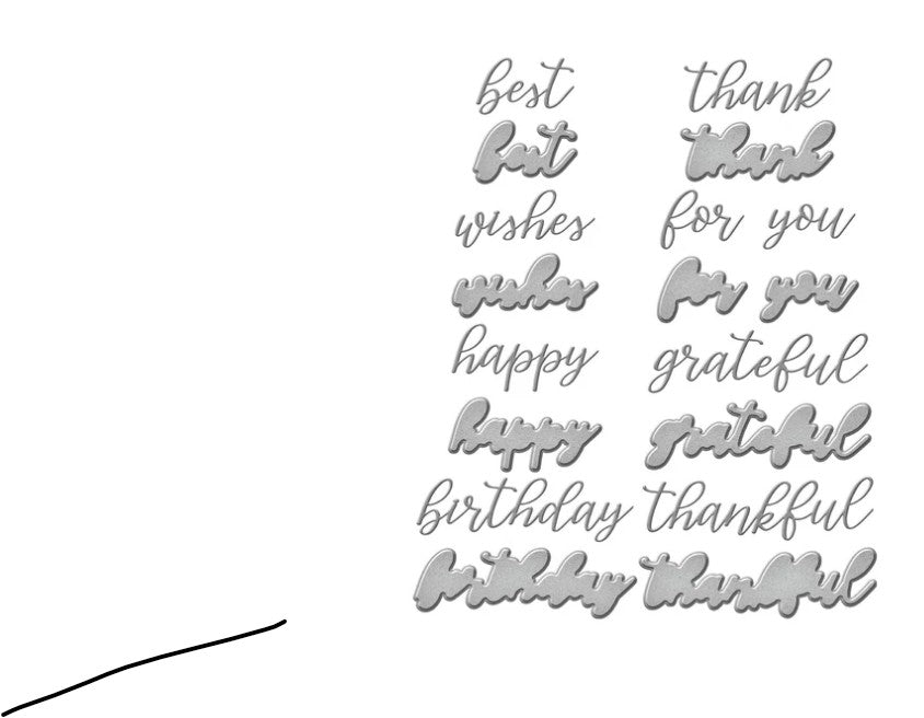 S4-1312Serenade Sentiments Etched Dies are part of the Serenade of Autumn Collection. Each word and its shadow in this set of 18 thin metal cutting dies creates a handwritten phrase for any occasion. Covers birthdays, thanks, grateful and everything in between. A wonderful set to have handy when creating a card.