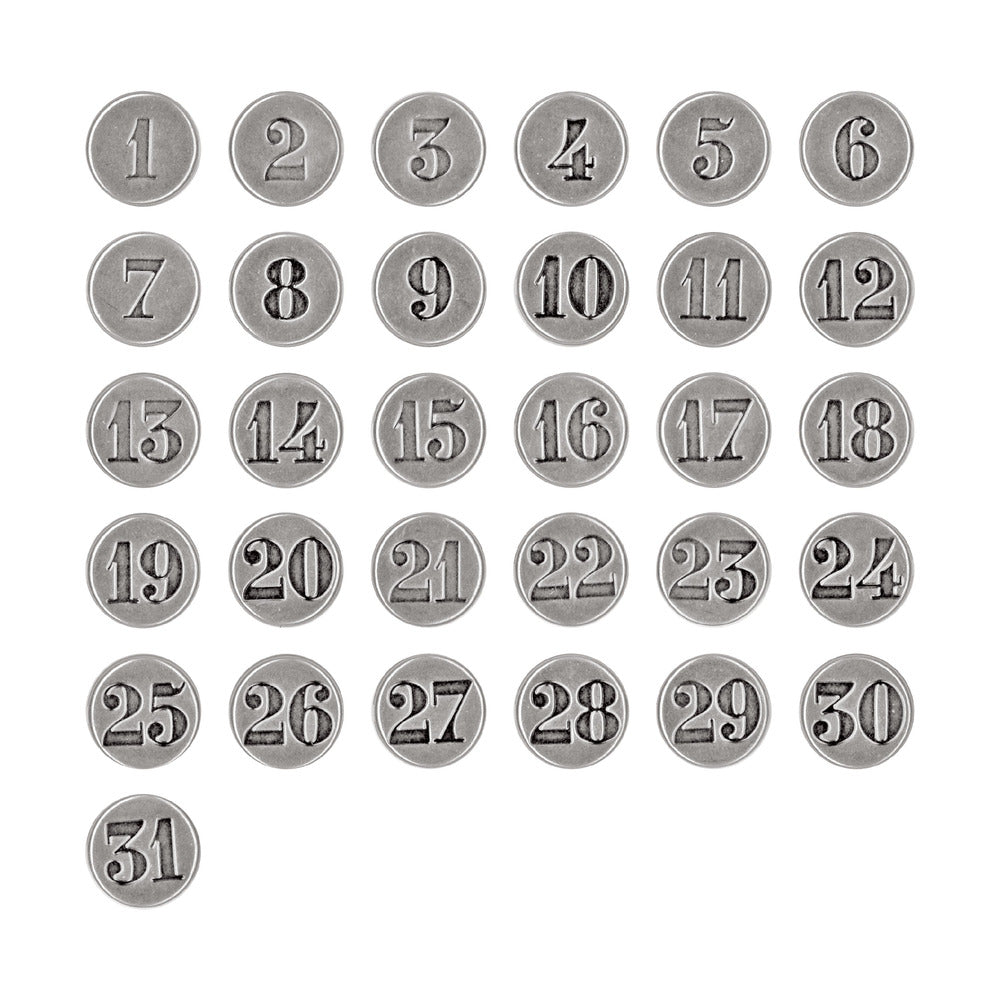 TH93679Metal Fasteners displaying numbers 1-31. Includes 31 brad with an antique nickel finish.