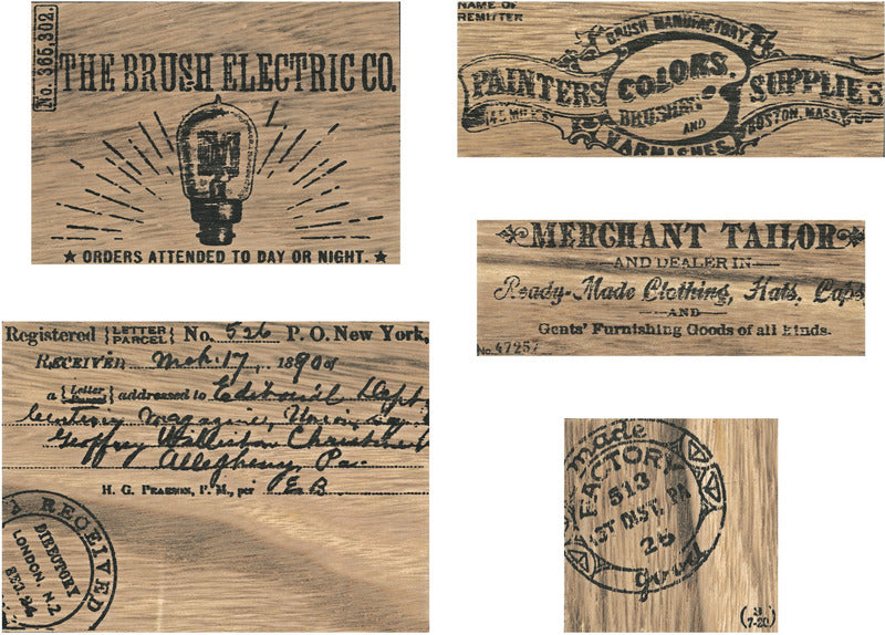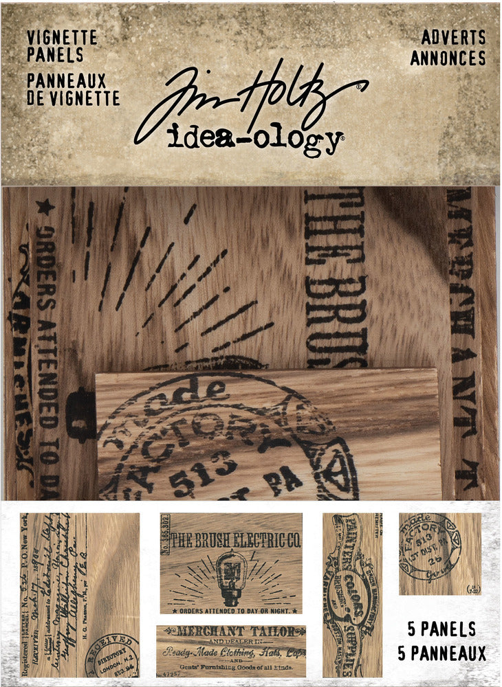 TH94124Tim Holtz Vignette Advert Panels are printed wooden panels with the appearance of distressed, stamped vintage advertisements and documents.