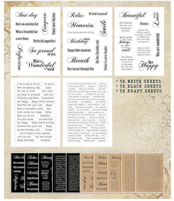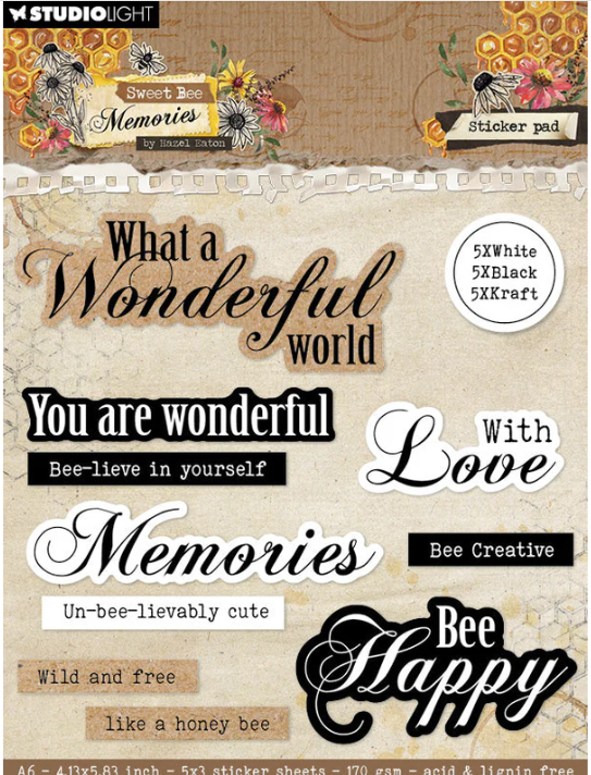 A collection of 15 sticker sheets with inspirational sentiments. This pad consists of white, black and kraft stickers. 5x white, 5x black and 5x kraft, acid and lignin free. Part of the Sweet Bee Memories collection.